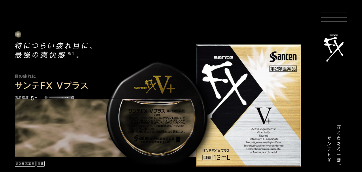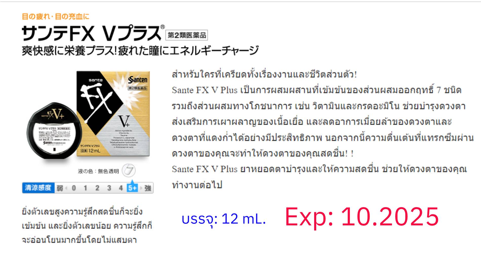 Sante FX V Plus เป็นการผสมผสานที่เข้มข้นของส่วนผสมออกฤทธิ์ 7 ชนิด รวมถึงส่วนผสมทางโภชนาการ เช่น วิตามินและกรดอะมิโน ช่วยบำรุงดวงตา ส่งเสริมการเผาผลาญของเนื้อเยื่อ และลดอาการเมื่อยล้าของดวงตาและดวงตาที่แดงก่ำได้อย่างมีประสิทธิภาพ นอกจากนี้ความตื่นเต้นที่แทรกซึมผ่านดวงตาของคุณจะทำให้ดวงตาของคุณสดชื่น! !