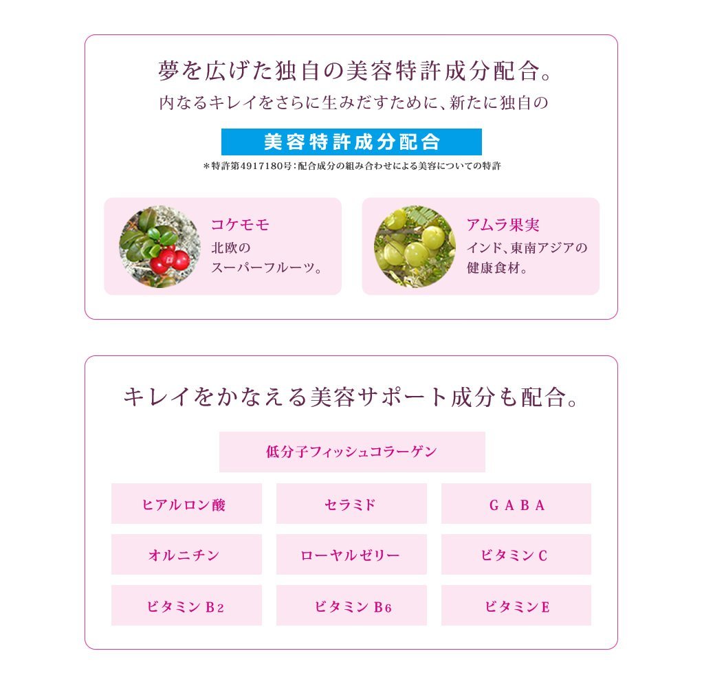 vitamin B2: 2mg, vitamin B6: 5mg, vitamin C: 50mg, vitamin E: 5mg, collagen: 1,000mg, hyaluronic acid: 5mg, ceramide: 600μg, GABA: 28mg, ornithine: 28mg, royal jelly (raw conversion) 50mg