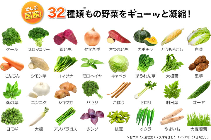 ตัวใหม่ สกัดจากผักที่ปลูกในญี่ปุ่น เกรดคัดพิเศษ พรีเมียม วิตามิน ผักรวม ในรูปแบบเม็ดผลิตและสกัดจาก ผักใบเขียว-เหลือง และผักต่างๆมากมายกว่า 32ชนิด