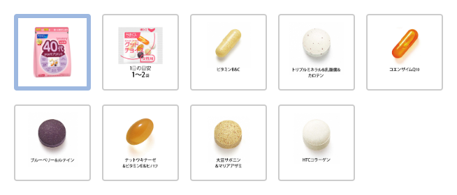วิตามิน A: 550μg [เบต้าแคโรทีน: 1.1 มก.], วิตามิน D: 0.42μg, วิตามินอี: 14.0 มก., วิตามิน K: 5μg, วิตามินบี 1: 8.8 มก., วิตามินบี 2: 4.0 มก., ไนอาซิน: 5 มก. วิตามิน B6: 5.8mg , กรดโฟลิก: 67 μg, วิตามินบี 12: 21.0 μg, ไบโอติน: 167 μg, กรดแพนโทธีนิค: 10.0 มก., วิตามินซี: 333 มก., แคลเซียม: 58 มก., แมกนีเซียม: 29 มก., น้ำมันปลาบริสุทธิ์ DHA: 150 มก. 83 มก., สารสกัดจากมาเรียธิสเซิล: 77 มก. (Silybin: 23 มก.), บลูเบอร์รี่ (Bilberry) สารสกัด: 60 มก. (แอนโธไซยานิน 36%), HTC Collagen (Tripeptide คอลลาเจนเปปไทด์เนื้อหาสูง): 58mg, α-Lipoic , Bacillus natto culture extract powder: 25 มก. (nattokinase: 500FU), ผงสารสกัดจาก Ibright: 20 มก., Inositol: 17 mg, ซาโปนินถั่วเหลือง: 17 mg, Tocotrienol: 6 มก., Vita ลง P (hesperidin): 3.8mg, สารลูทีน: 1.2mg เป็น isoflavone ถั่วเหลือง aglycone: 0.125mg (คุณสมบัติคล้ายรวม: 0.2 มิลลิกรัม)